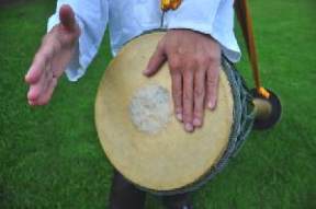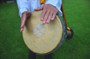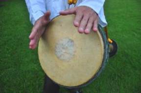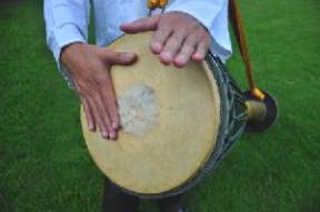 างขอบกลองและจากลอง โดยตีใหฝามือ