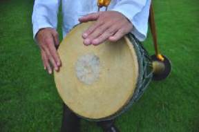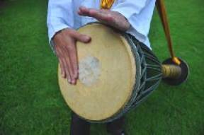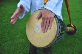 างขอบกลองและจากลอง โดยตีใหฝามือ
