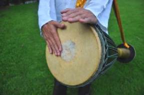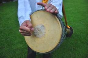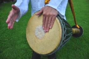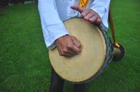 างขอบกลองและจากลอง โดยตีใหฝามือ